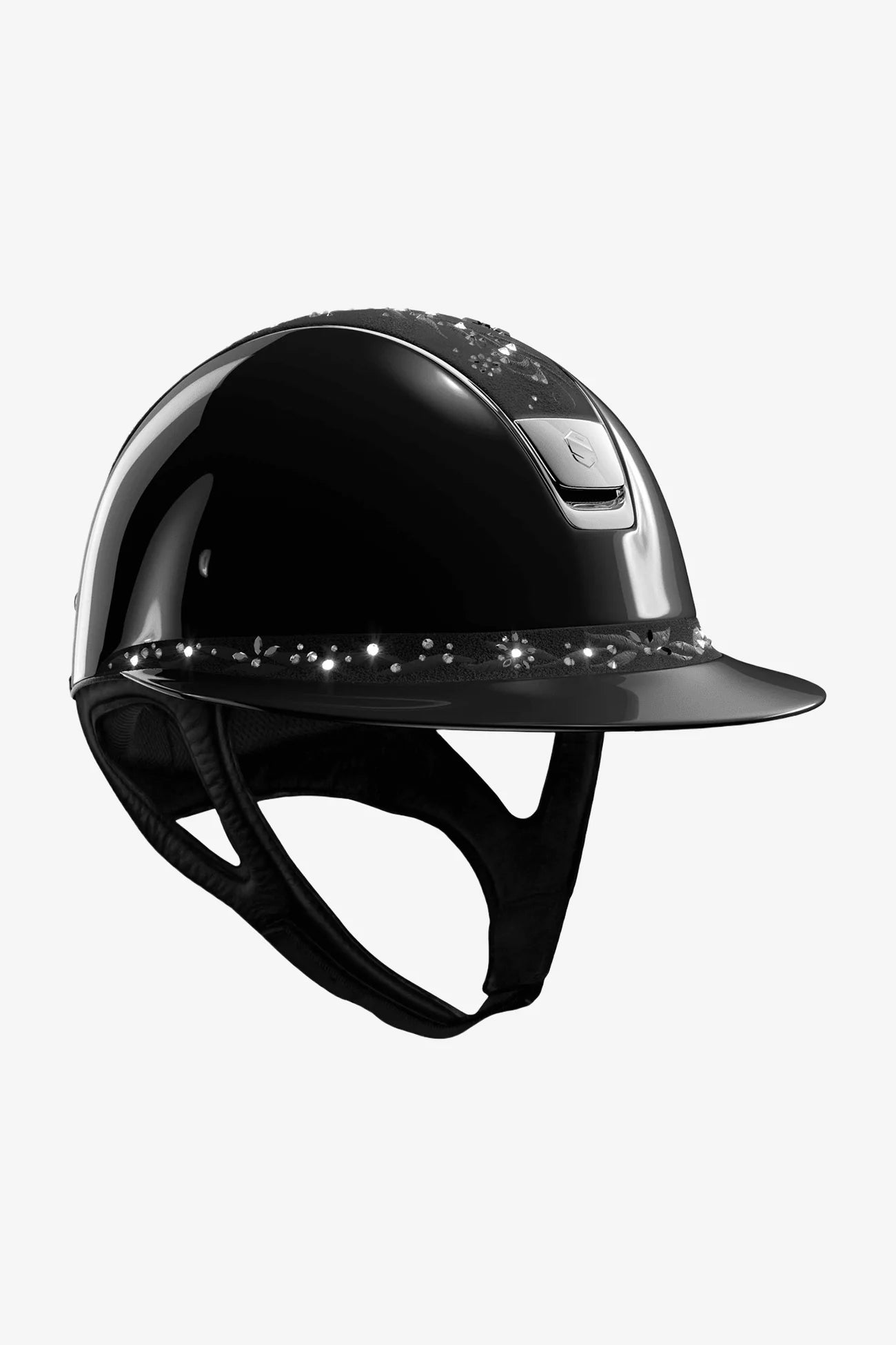 Glossy skal med solskärm samt Top och Frontal Band med Flower Jewelry Svart/Svart, Silver Crome på Trim och Blazon och dressyrskurning bak.
