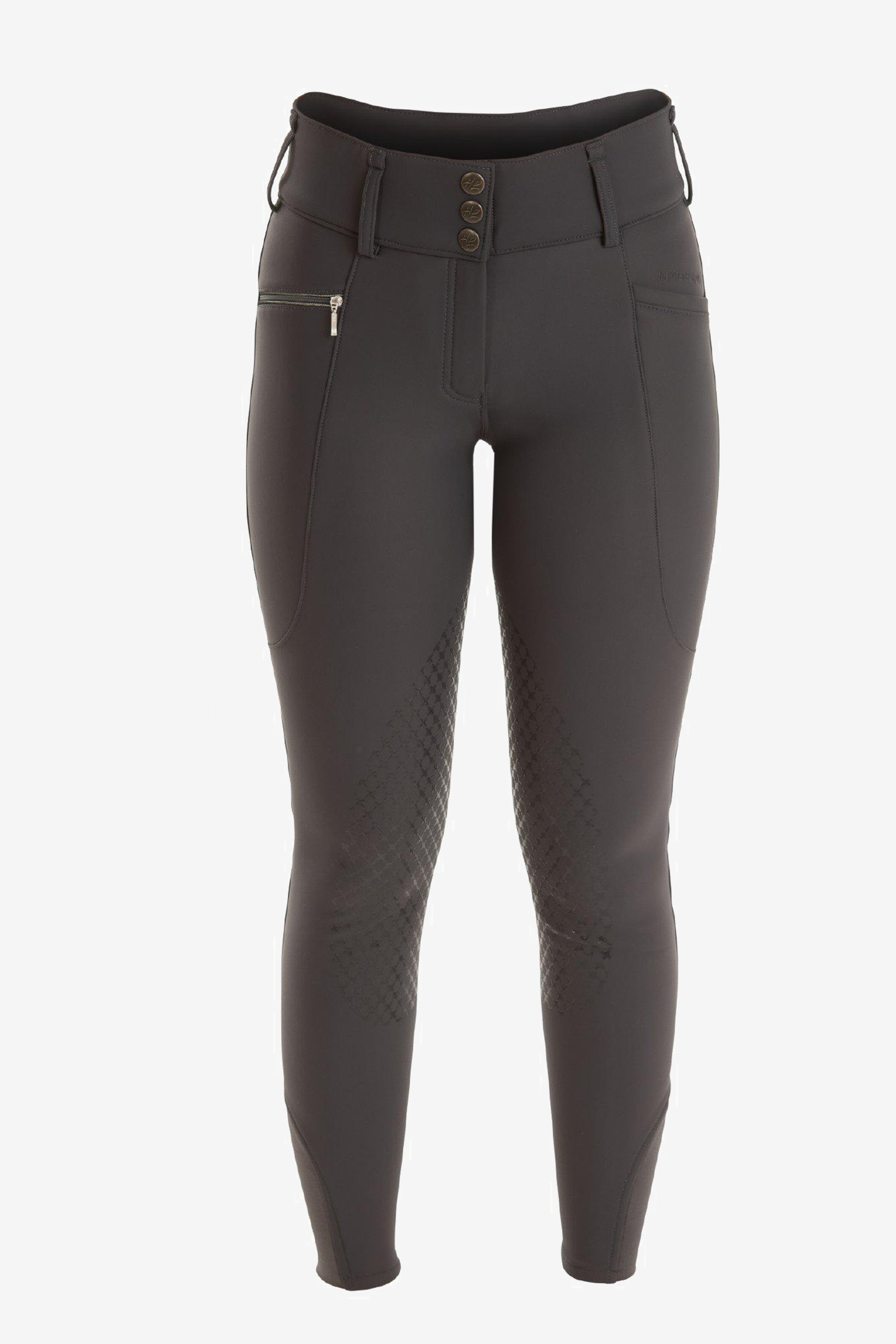Den bekväma 4-vägsstretchen gör att byxan följer dina rörelser oavsett om du rider, fixar i stallet eller lastar hästen. Den höga midjan med bred linning och tre knappar ger både stöd och en smickrande siluett. Framtill finns två djupa mobilfickor, varav en med dragkedja och dekorativ silverpasspoal – praktiskt och snyggt på samma gång. Baktill har byxan en elegant okskärning som lyfter helhetsintrycket.