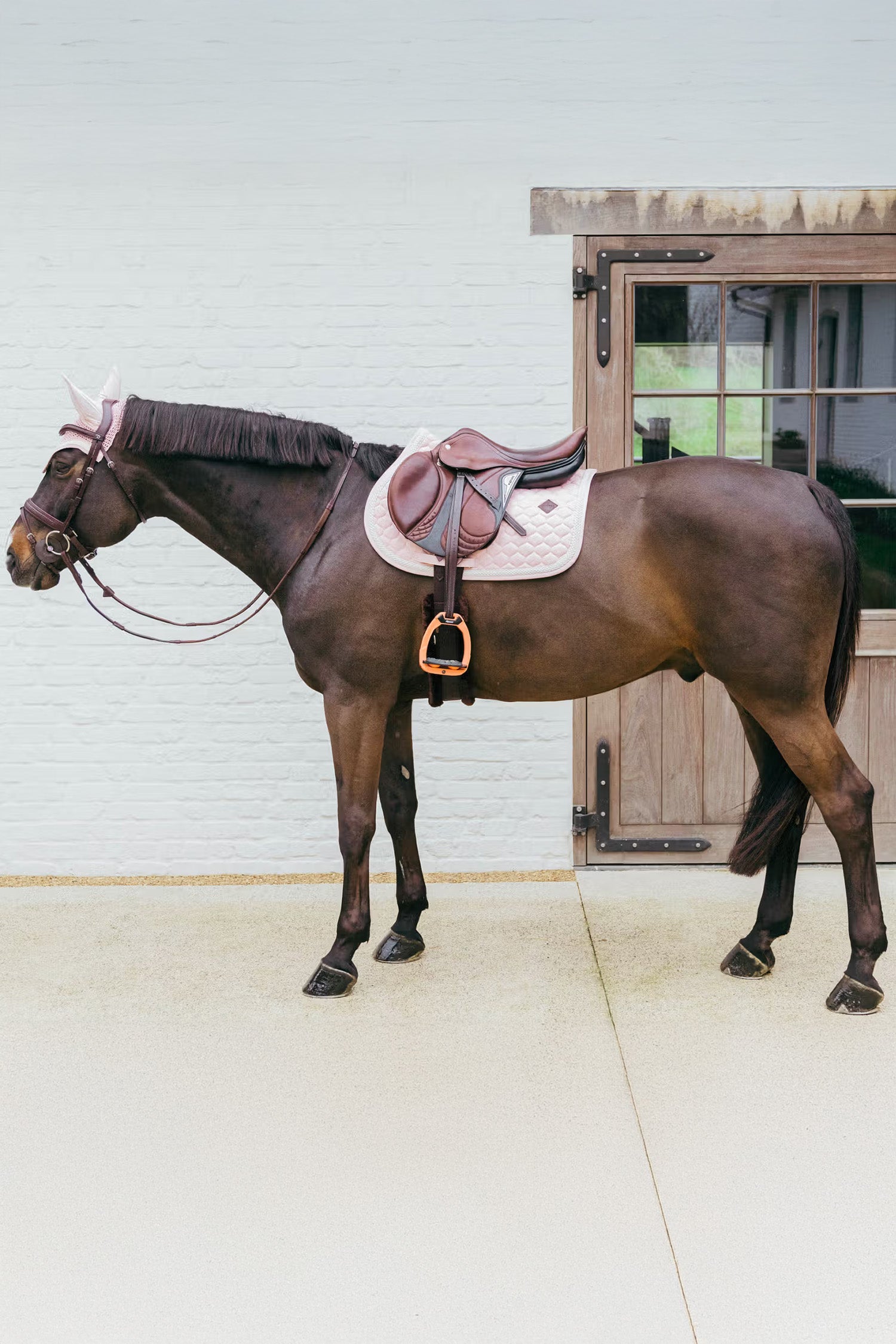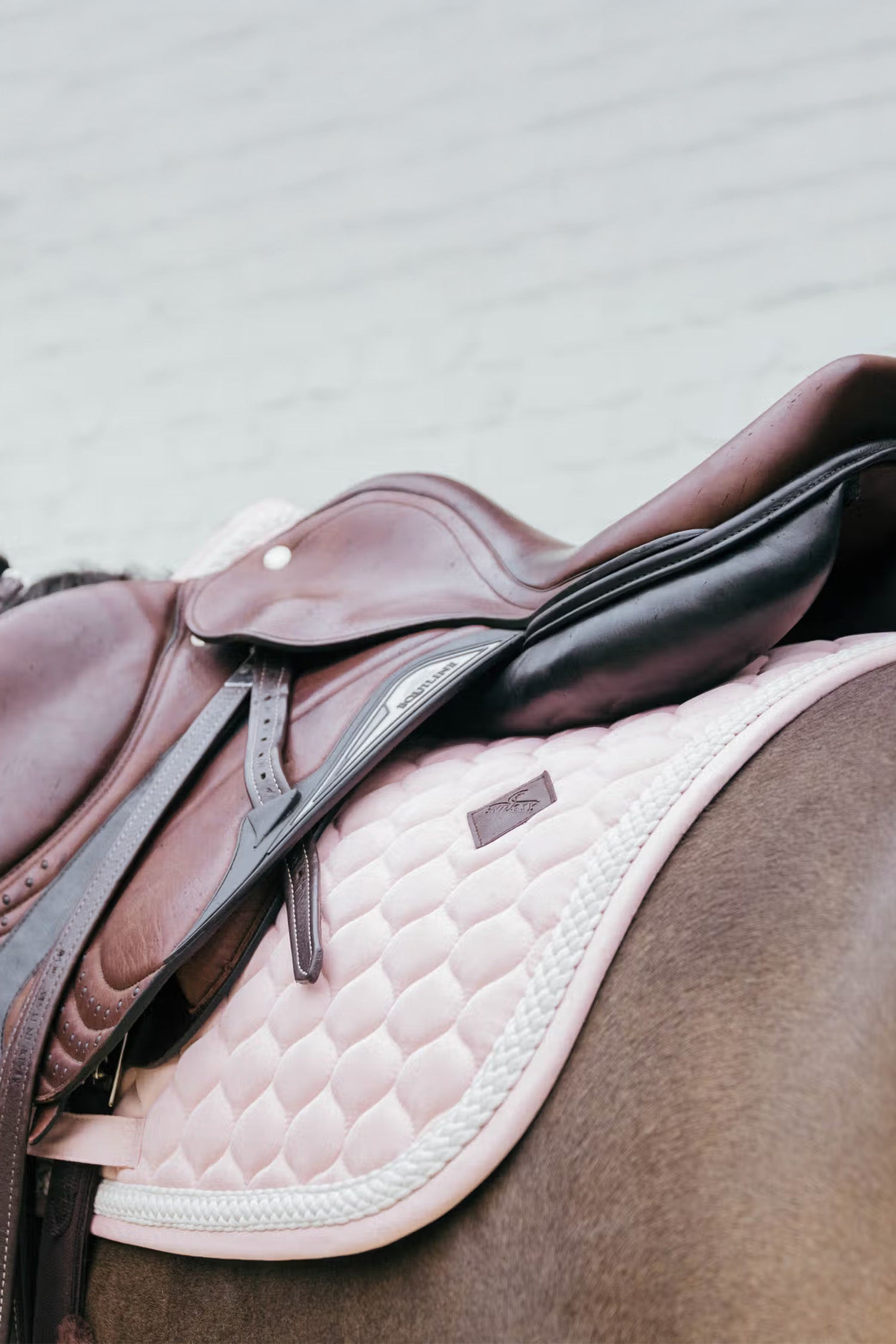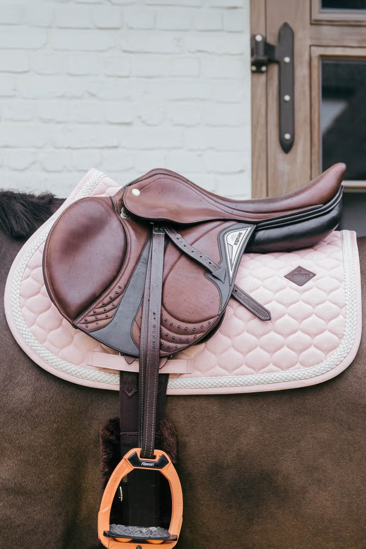 Designat med ett fint quiltat mönster tillsammans med den flätade passpoalen ger det ett klassiskt och snyggt modernt utseende. Passar lika väl på tävling eller träning. En snygg och diskret detalj är Kentucky logon i veganskt läder patch på vänster sida.