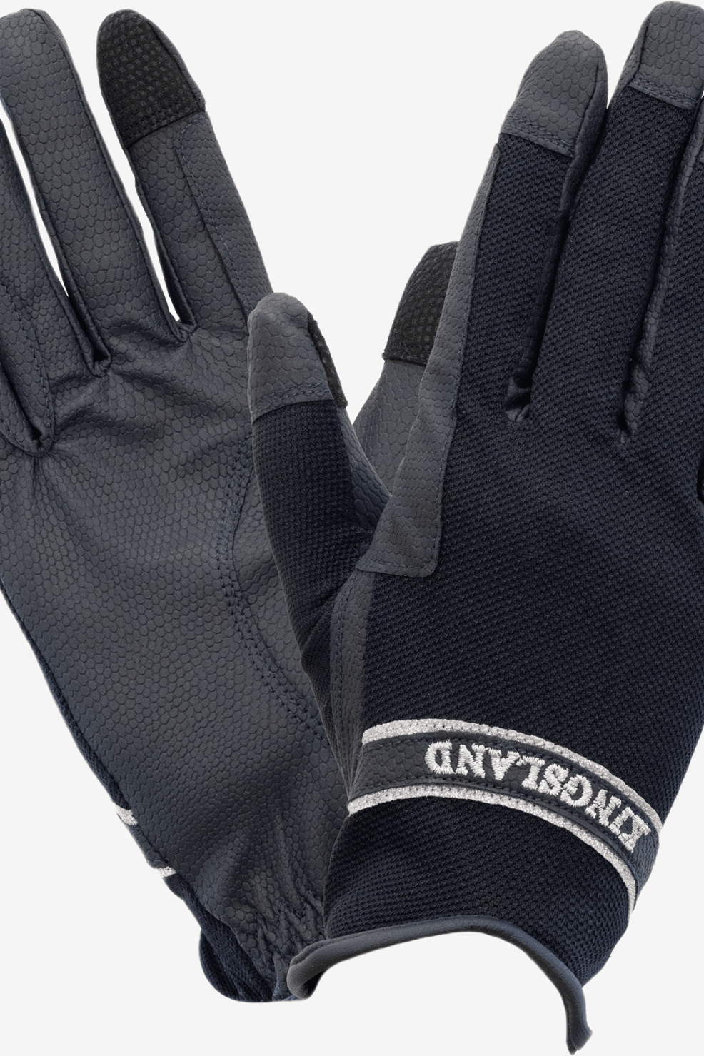 Sommarens måste-ha ridhandskar från Kingsland! Handskarna är tillverkade av en kombination av PU-läder och lättviktig mesh med hög andningsförmåga, vilket ger överlägsen komfort och perfekt passform. Med pekskärmsfunktionen kan du använda din telefon eller surfplatta utan att behöva ta av dig handskarna, medan den feminina designen med silverglittriga ränder och silverlurexbroderad logotyp ger en touch av glamour till din ridoutfit.