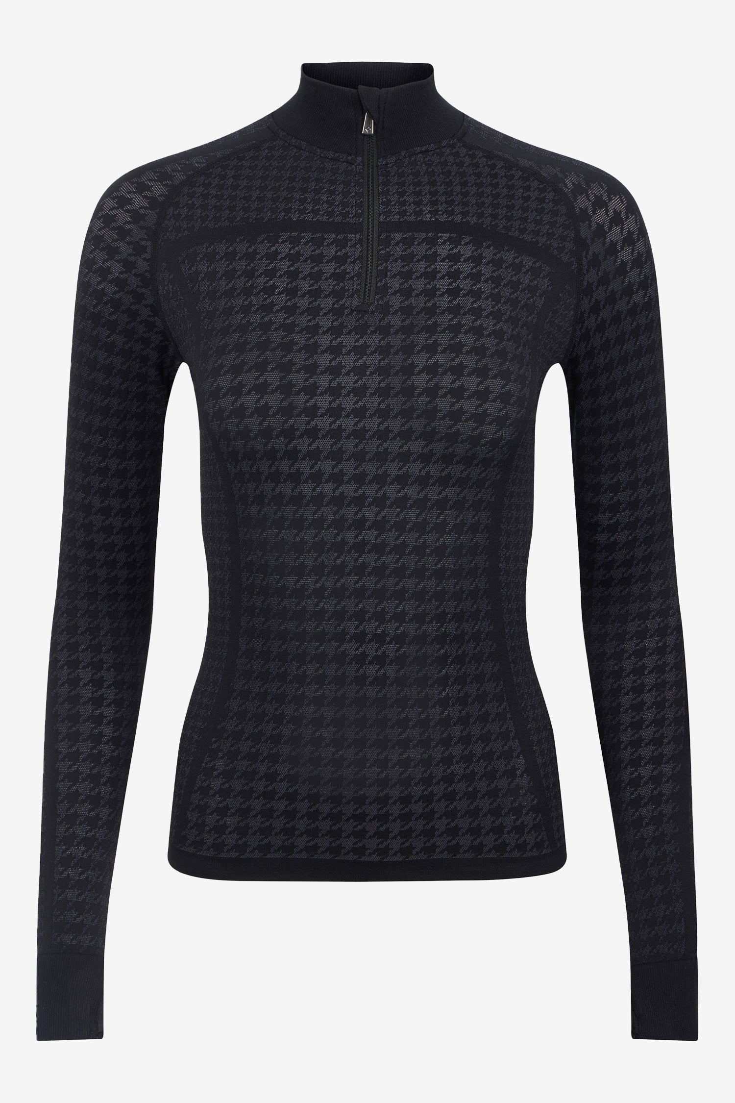 Det lätta, svettavvisande materialet håller dig torr och bekväm, medan det diskreta houndstooth-mönstret ger en elegant, sportig look. Den ribbade kragen med quarter zip-dragkedja och muddar med tumhål gör tröjan både funktionell och snygg i lager-på-lager-styling.