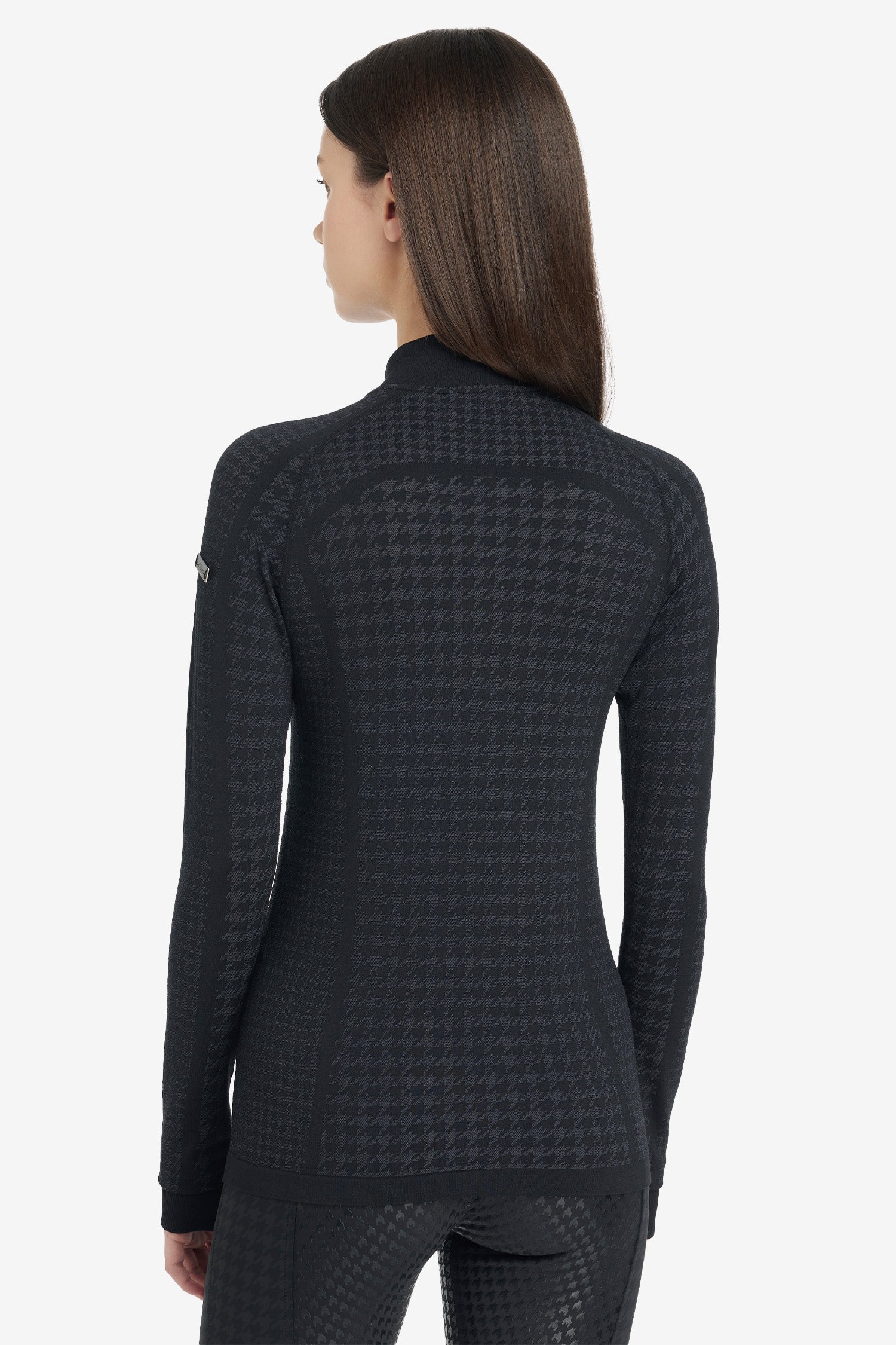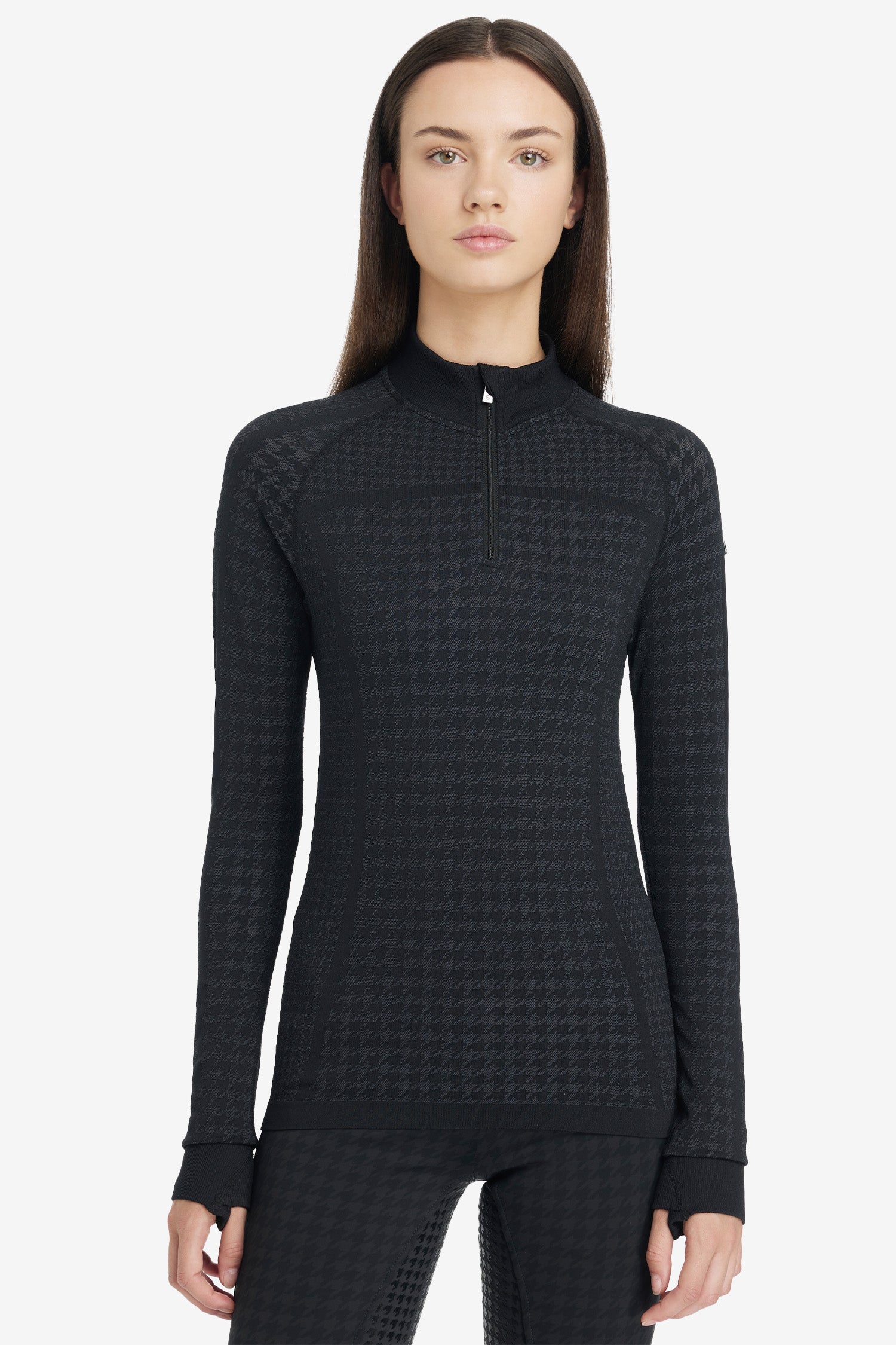 Aspen Houndstooth Quarter Zip Top är en stilren, kroppsnära träningströja som rör sig med dig – oavsett om du rider, tränar i stallet eller är på språng till vardags. Den är 360° sömlöst stickad för maximal komfort och följsamhet, vilket ger en smickrande passform utan skav.