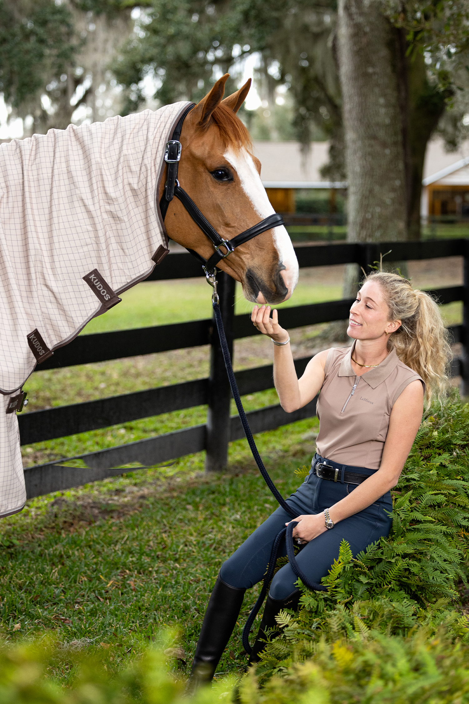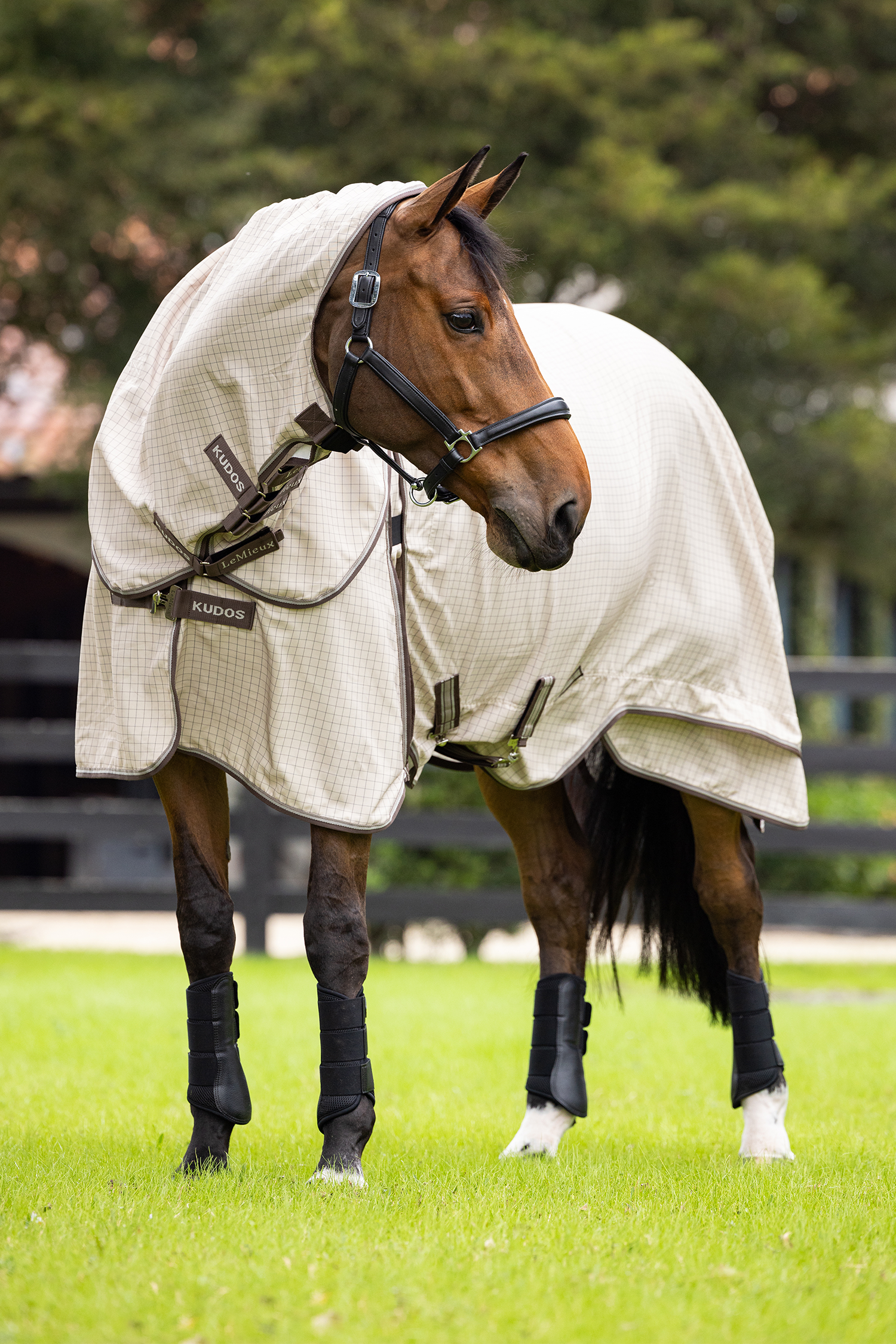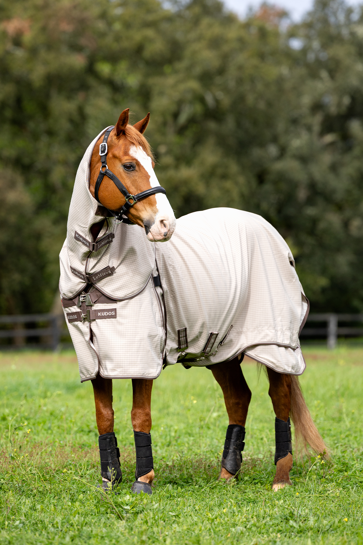 Kudos Field Rug har LeMieuxs patenterade tvådelade kjol som följer hästens rörelser och ger maximal frihet vid lek, rullning och bete. Designen minskar drag och spänning runt täckets bakre kant, vilket gör det extra bekvämt för hästar som går mycket ute. Täcket levereras med en lätt, avtagbar halsdel, så att du enkelt kan anpassa skyddet efter väder och hästens behov.
