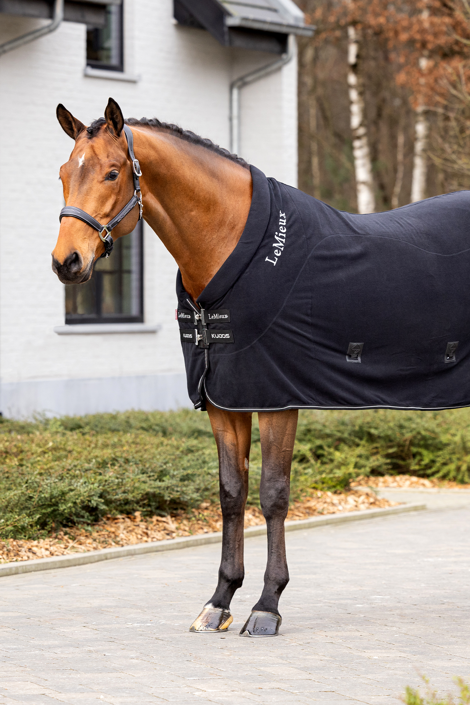 LeMieux Kudos Fleece Cooler Rug Black är ett exklusivt fleecetäcke i mjuk, anti-pilling polar fleece som effektivt transporterar bort fukt och hjälper hästen att torka snabbt efter ridpass eller dusch. Det svarta täcket har en stilren design och en passform som följer hästens linjer för att ligga stilla och bekvämt.