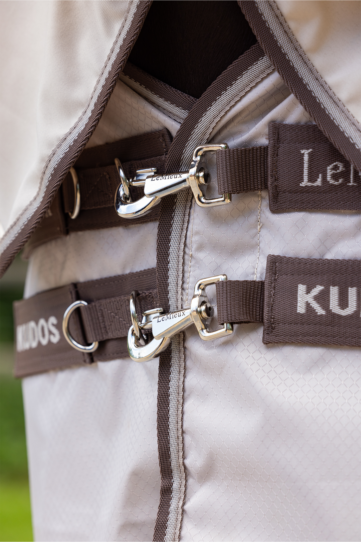Täcket har en full hals som fästs över öronen för att ge maximalt skydd över man, nacke och mankam. Halsen är avtagbar, vilket gör det enkelt att anpassa täckningen efter väder. Extra lång svansflik skyddar svansrot och bakdel, medan 3D-meshvaddering vid manken ger både stötdämpning och god ventilation. Insidan på rygg, bog och hals är fodrad med antistatisk och antibakteriell lining som är skonsam mot pälsen och hjälper till att motverka skav och irritation.