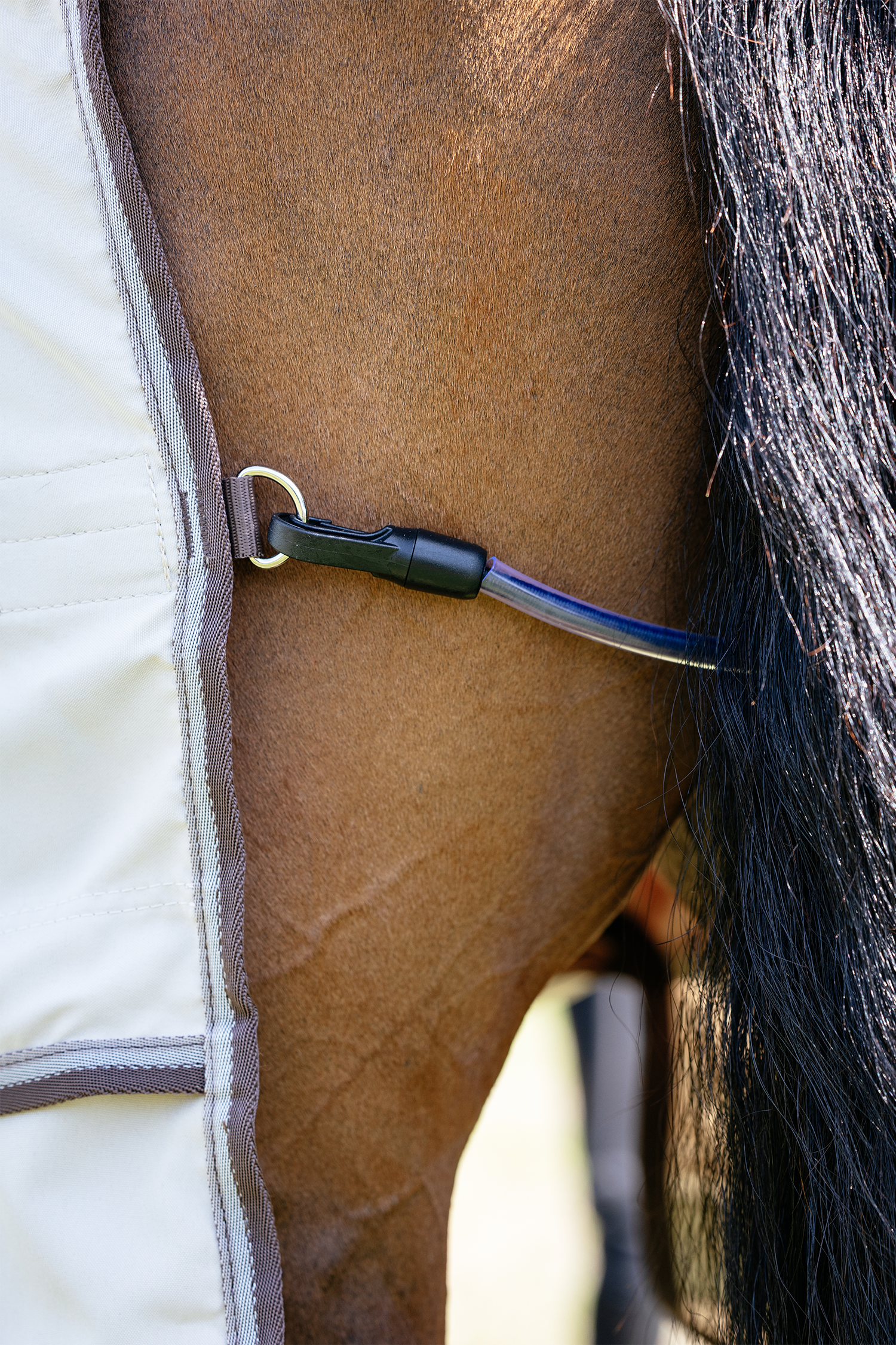 Justerbara, dubbla snabbspännen framtill samt genomtänkta remmar och infästningar gör att täcket sitter stabilt på plats även när hästen rör sig mycket i hagen. Kombinationen av vattentät topp, fullt skyddande mage, lång svansflik och heltäckande hals gör detta täcke till ett komplett skydd för hästar med sweet itch eller kraftig insektskänslighet.