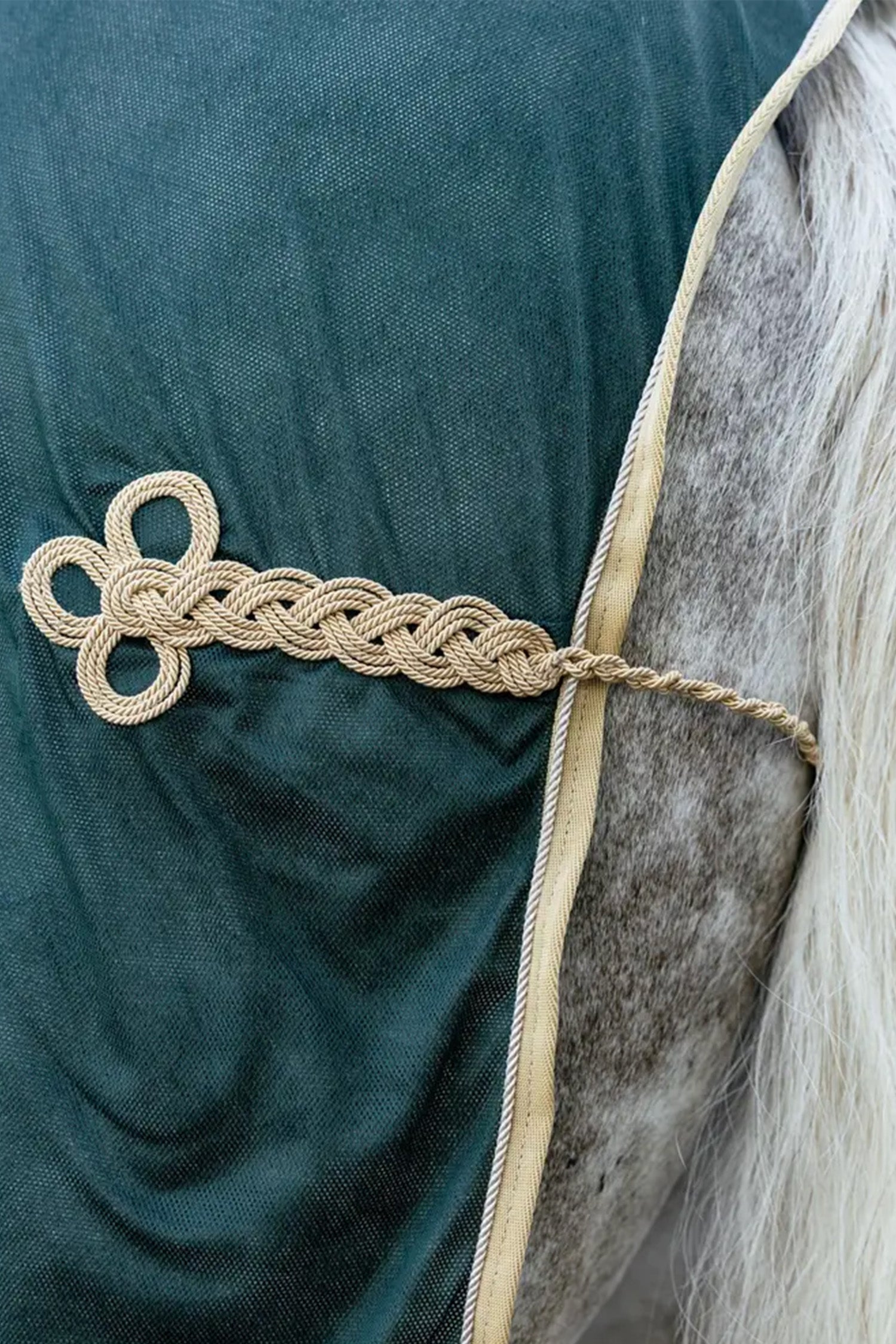 Det stilrena utförandet i klassiska färger, tillsammans med kontrastpasspoal och ett traditionellt flätat höftornament, ger täcket en exklusiv känsla som lyfter helheten på tävlingsplatsen.