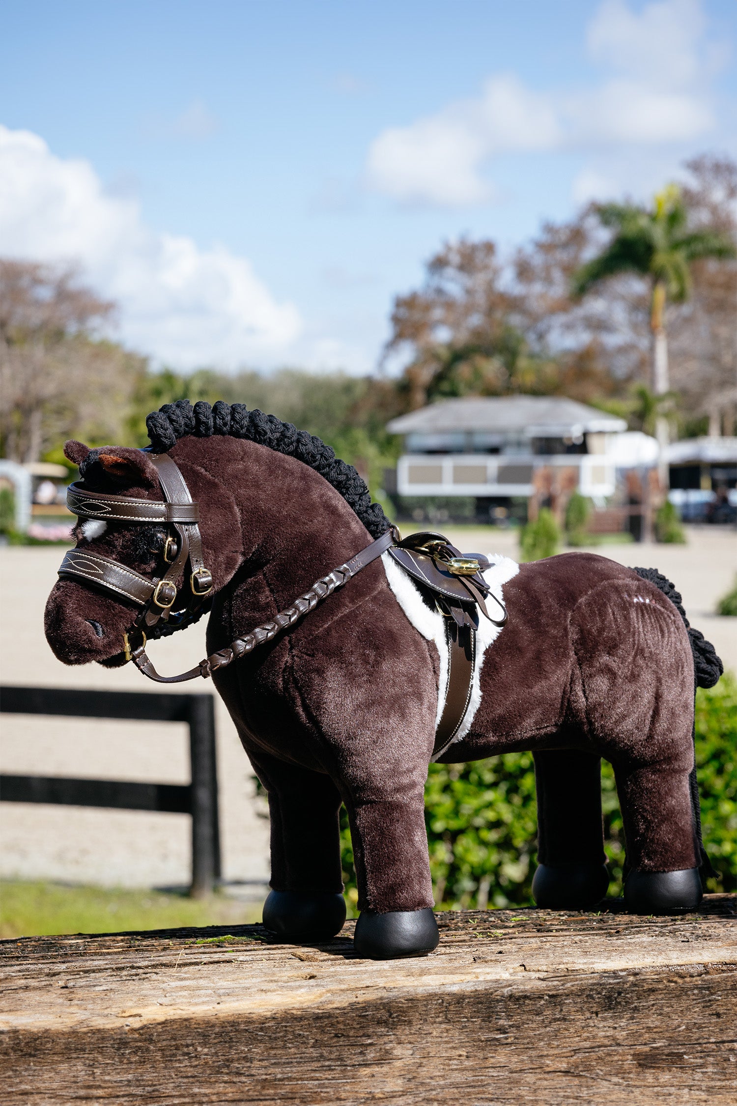 Klä din Toy Pony i klassisk hunterstil med detta matchande set. Paketet innehåller en quiltad vojlock i mockaliknande material med vit fleecekant samt en brun sadelgjord med mjuk fleecefodring.