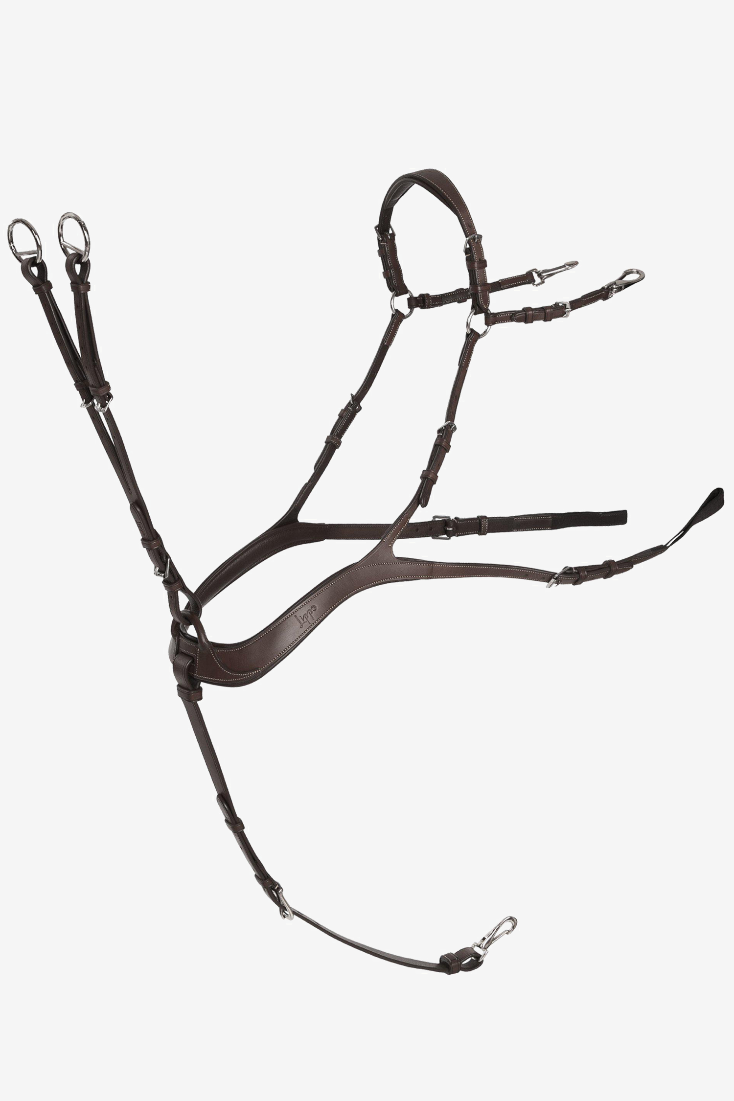 En genomtänkt, flexibel brösta för dig som vill ha toppkänsla i sadeln och en häst som kan röra sig fritt – med Lippo 5-punkts förbygel/brösta/martingal får du både funktion och stil i ett.