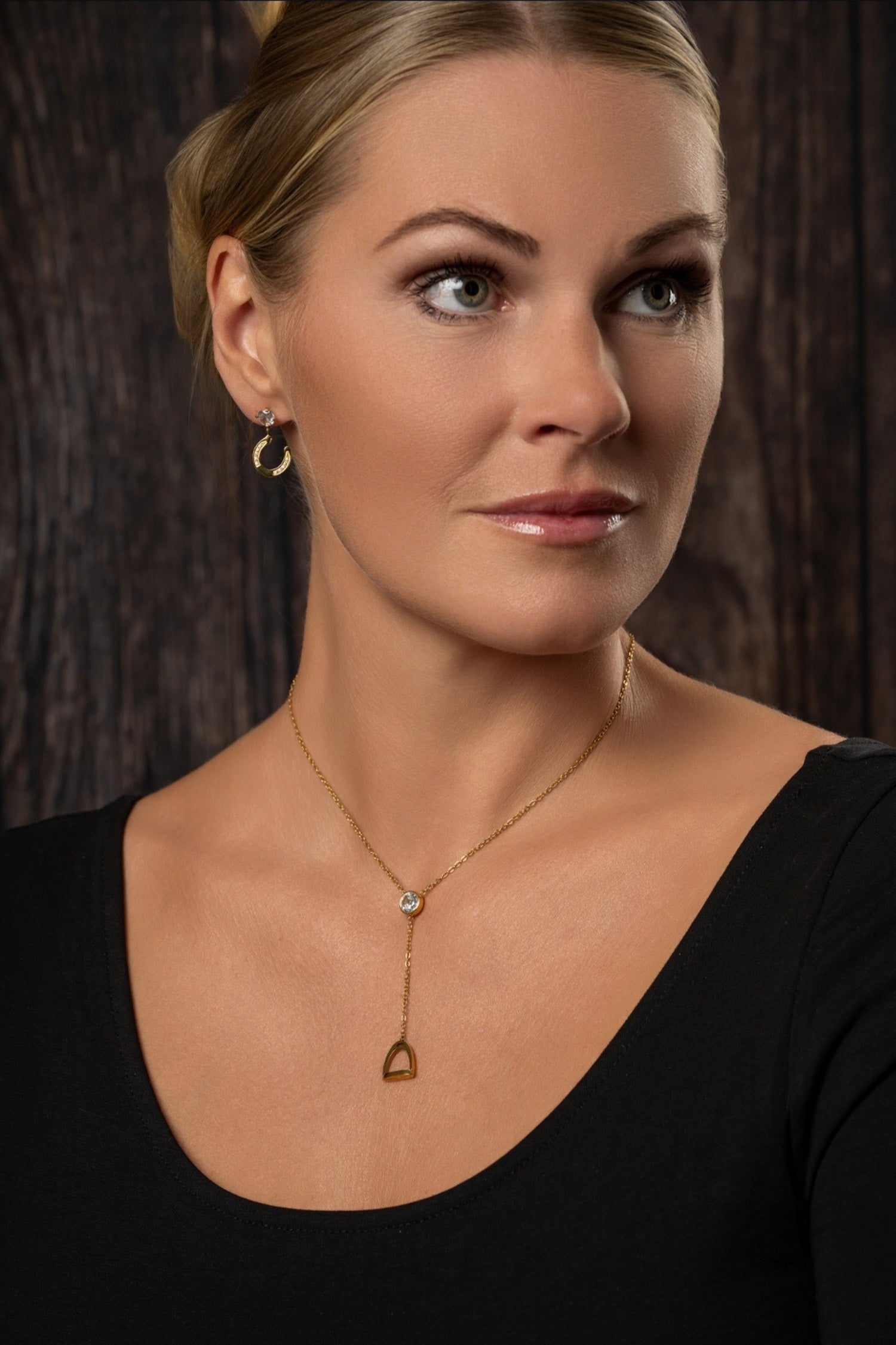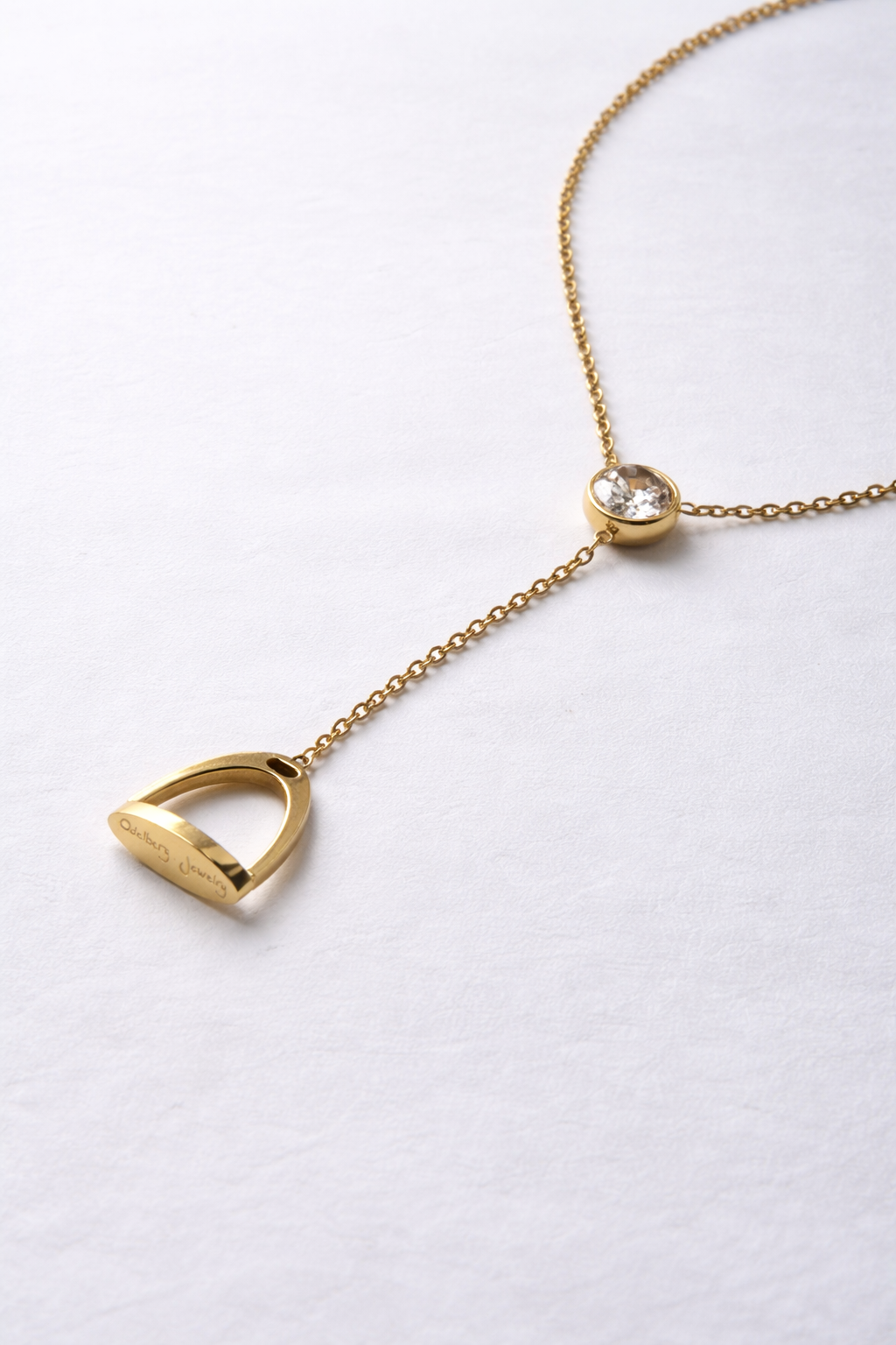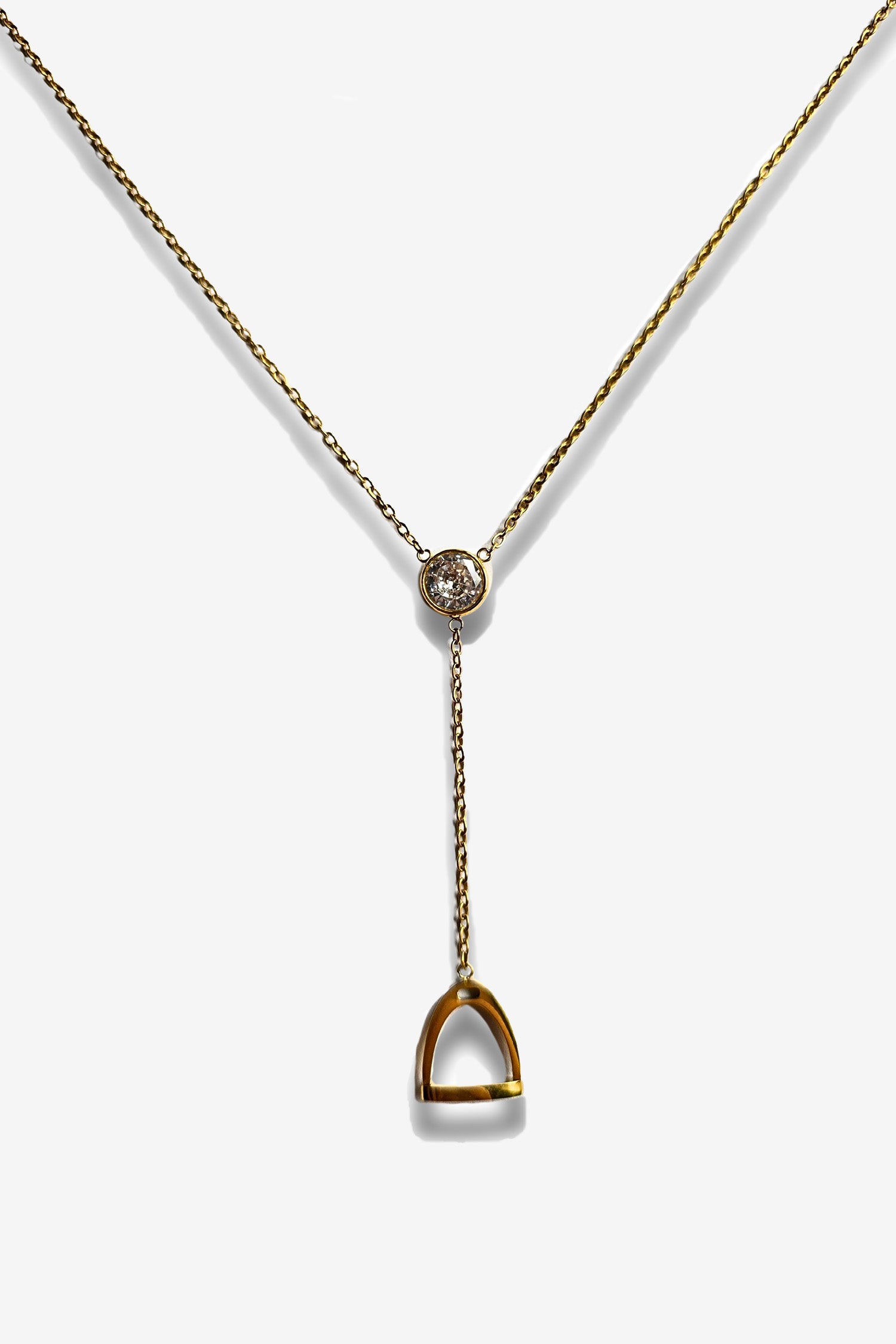 Detta halsband kombinerar en skimrande sten med en elegant utformad stigbygel som hänger fint i kedjan. Designen ger ett sofistikerat uttryck som fungerar lika väl till vardags som till mer uppklädda tillfällen.