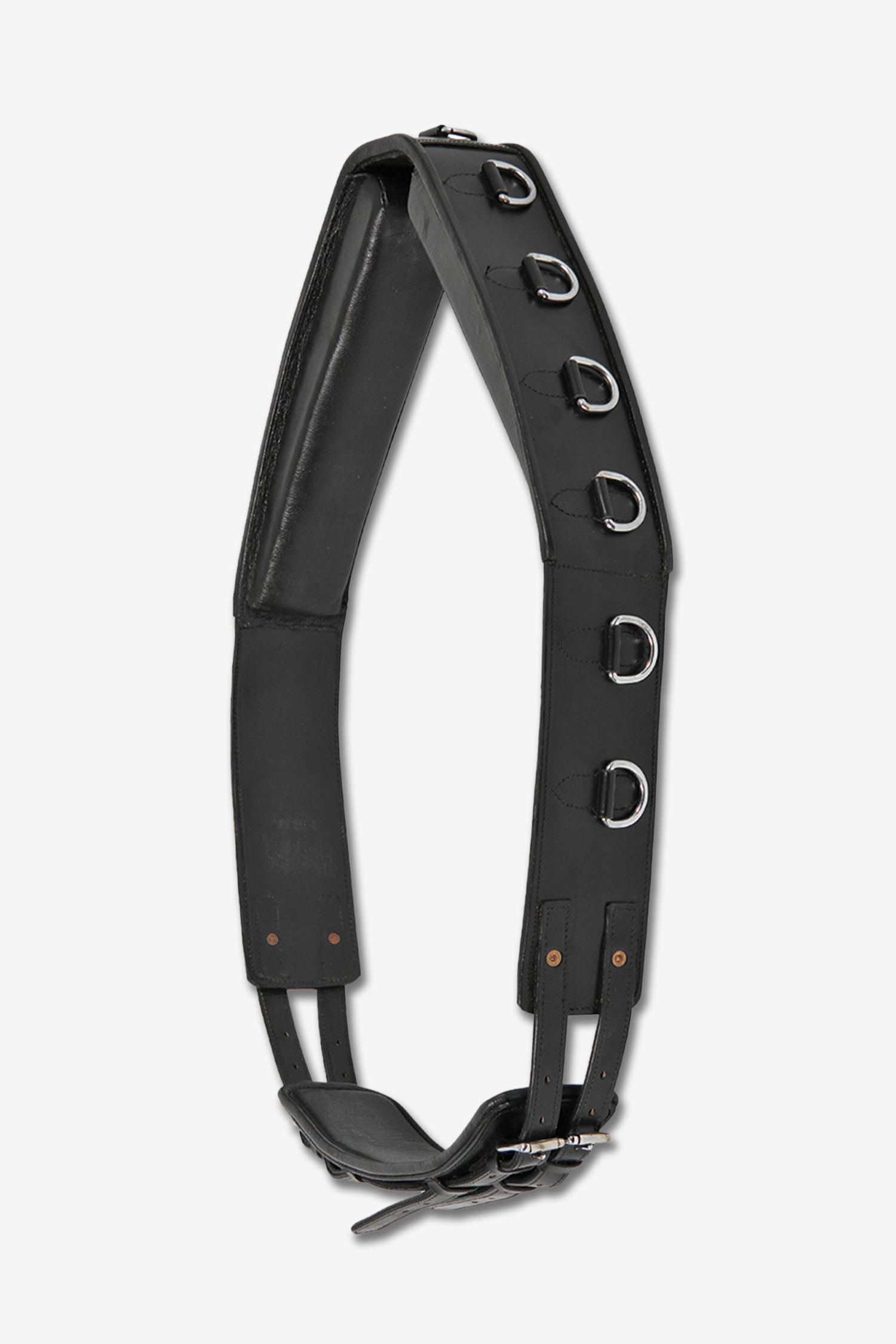 Longergjord i läder är ett stabilt och funktionellt träningsredskap för longering av häst. Den är tillverkad i slitstarkt läder och utformad för att ge många möjligheter till individuell anpassning vid träning från marken.