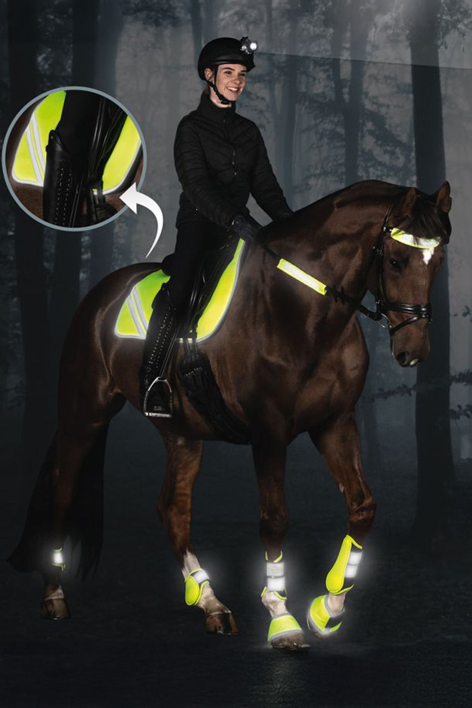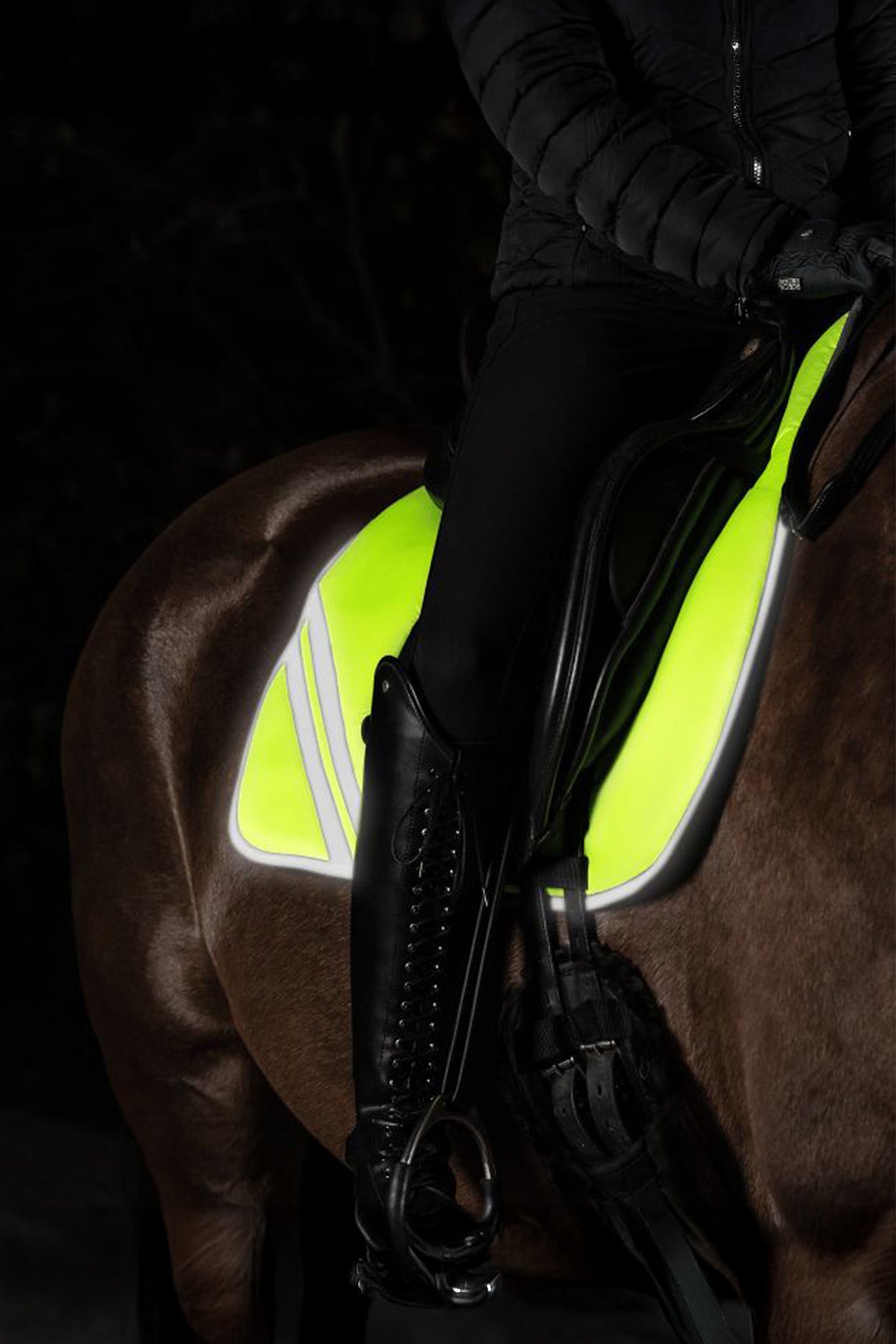 Ett schabrak som kombinerar säkerhet, komfort och stil. Det neongula yttertyget med reflekterande kantband och dubbla reflexränder på båda sidor gör både häst och ryttare synliga även i mörker och dimma. Perfekt för uteritter under höst och vinter, när ljuset är begränsat.